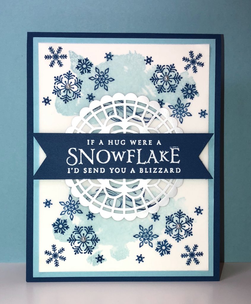 - Cut a piece of Vellum cardstock to 3 3/4″ x 5″. You will stamp the snowflakes and “wind” in Bermuda Bay on this piece.Then glue to Whisper White piece.