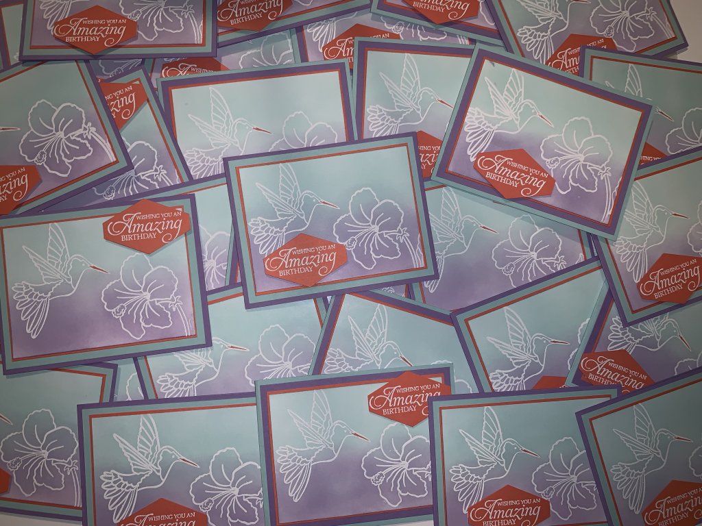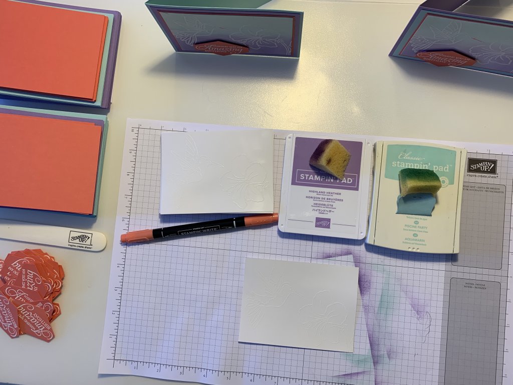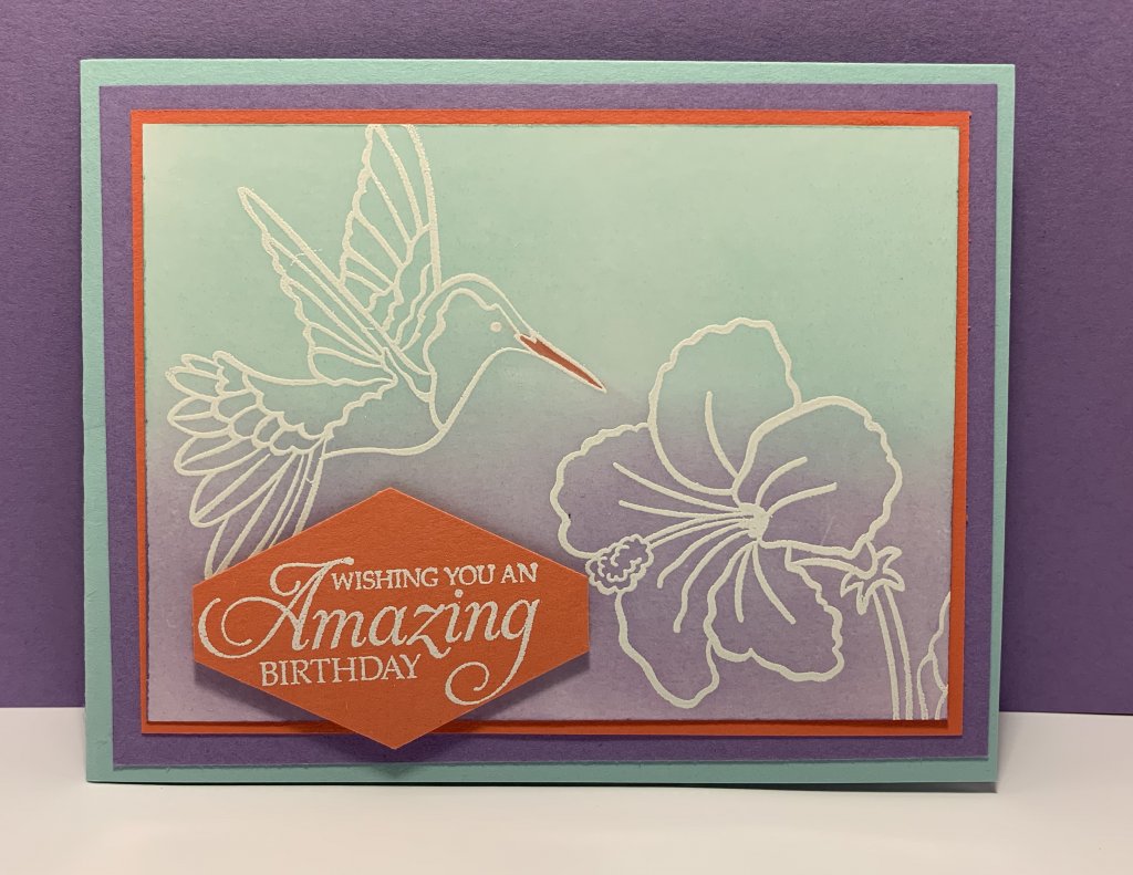 I was so excited about the colors for April’s Color Challenge! Pool Party and Highland Heather are two of my favorite colors!! I just had to add a little Calypso Coral (which is a great accent to those colors) and Whisper White to create my card. I used a technique that Sharon Armstrong had shared on her blog and I just loved the way it turned out! In the video I give you glimpse of some of my other humming bird attempts to show you the progression of how I got to my card design.